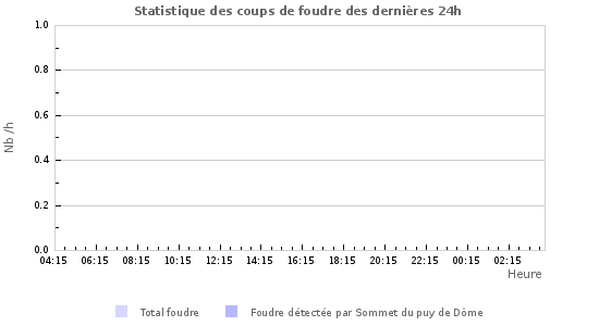 Ici vous pouvez voir la totalité des coups de foudre comptabilisés par le réseau Blitzortung, la quantité de coups de foudre par heure de la station Sommet du puy de Dôme - 1465 m ainsi que qté moyenne des coups foudre de toutes les autres stations